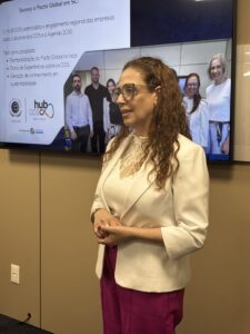 Na sequência, Gisele Victor Batista falou brevemente sobre o Hub ODS SC, ressaltando seu papel como plataforma de conexão entre empresas, organizações e iniciativas comprometidas com os ODS, além de seu potencial para fortalecer a atuação regional e fomentar a troca de experiências em sustentabilidade.