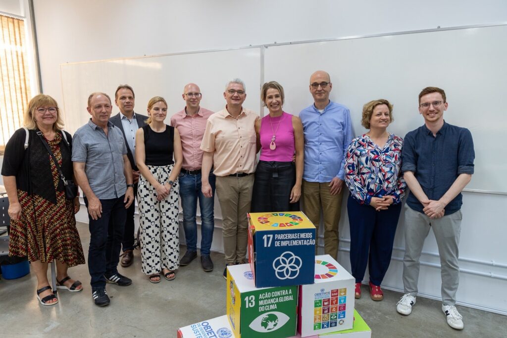 Na sequência, o professor e arquiteto responsável pelo projeto paisagístico do campus, Karol Carminatti, conduziu um tour pelos espaços e apresentou a relação de cada intervenção com os Objetivos de Desenvolvimento Sustentável (ODS). A visita foi finalizada após a delegação germânica conhecer as instalações do Bloco F (Bloco da Saúde).
